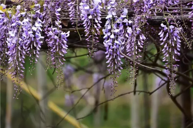 成年的紫藤植株莖蔓蜿延屈曲,開(kāi)花繁多,串串花序懸掛于綠葉藤蔓之間,瘦長(zhǎng)的莢果迎風(fēng)搖曳,這就是紫藤的風(fēng)采。